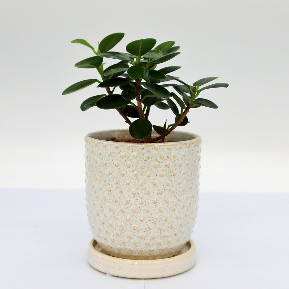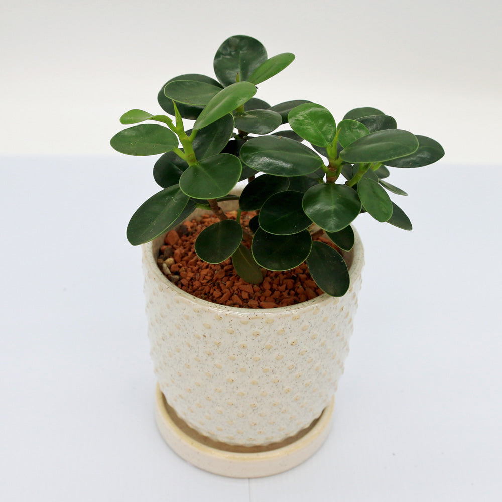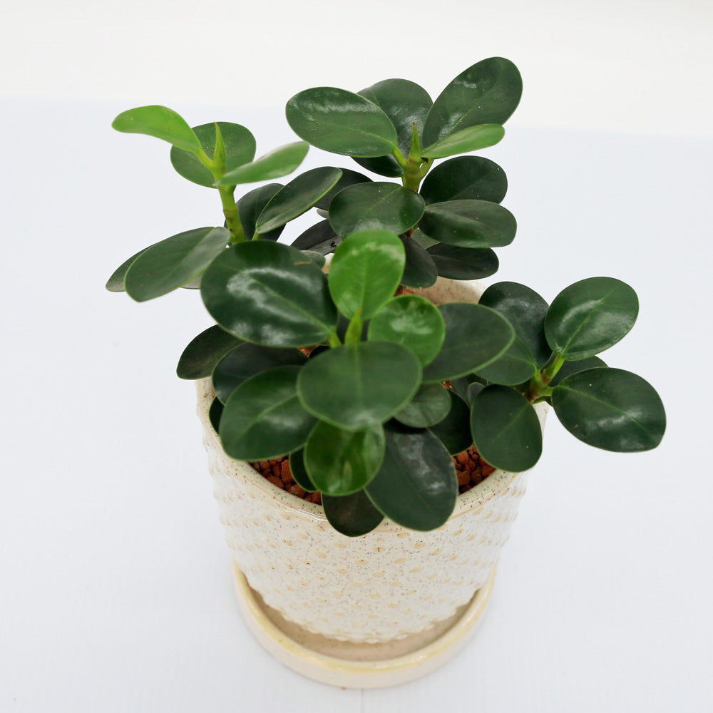 一般的なガジュマルとパンダガジュマルの最大の違いは葉の形です。一般的なガジュマルの葉は、少し細長くて力強い雰囲気を持っています。パンダガジュマルは丸くて可愛らしい葉をしています。肉厚で光沢のある小さな葉はキレイな濃い緑色をしており、このまん丸な葉が癒し効果があると人気になっています。
