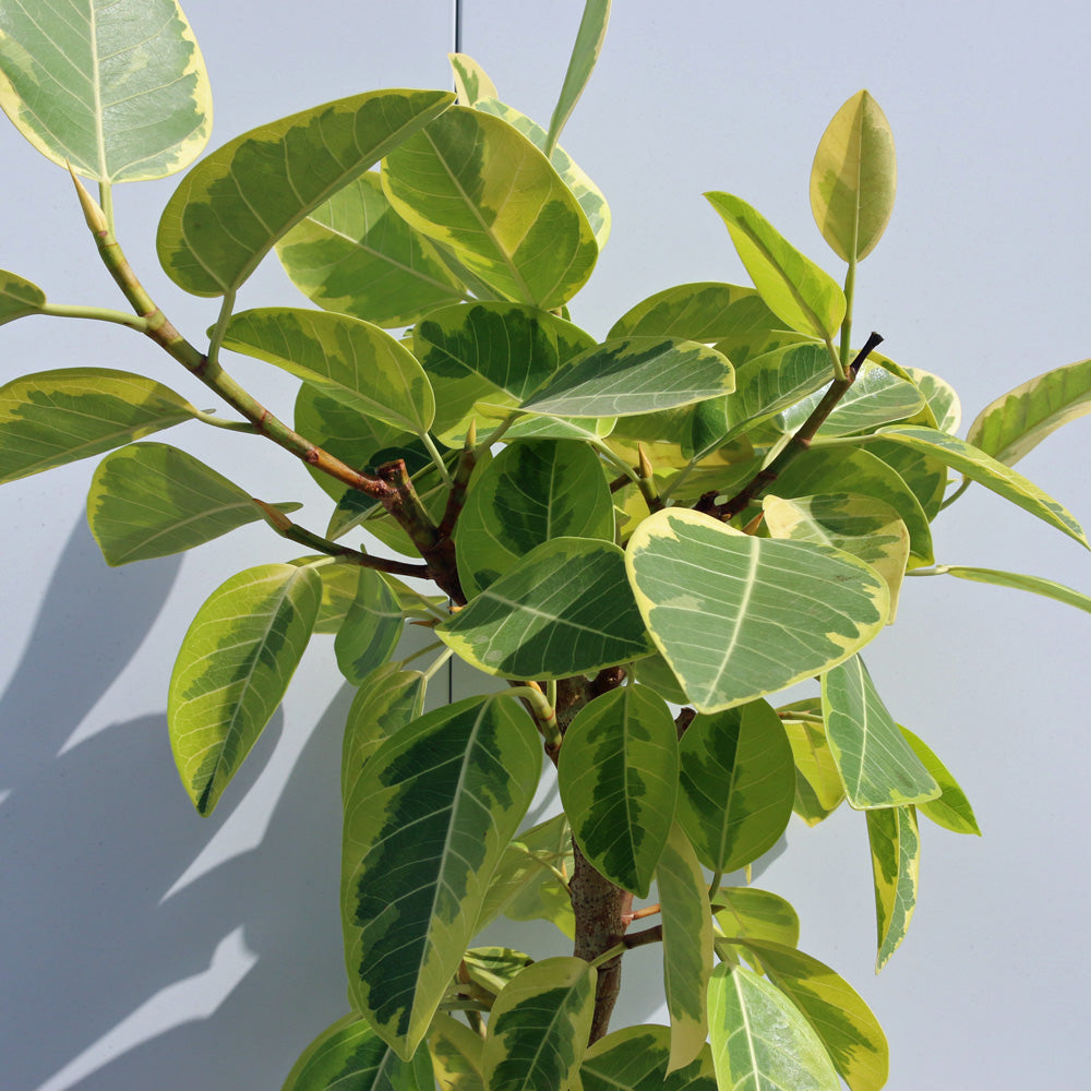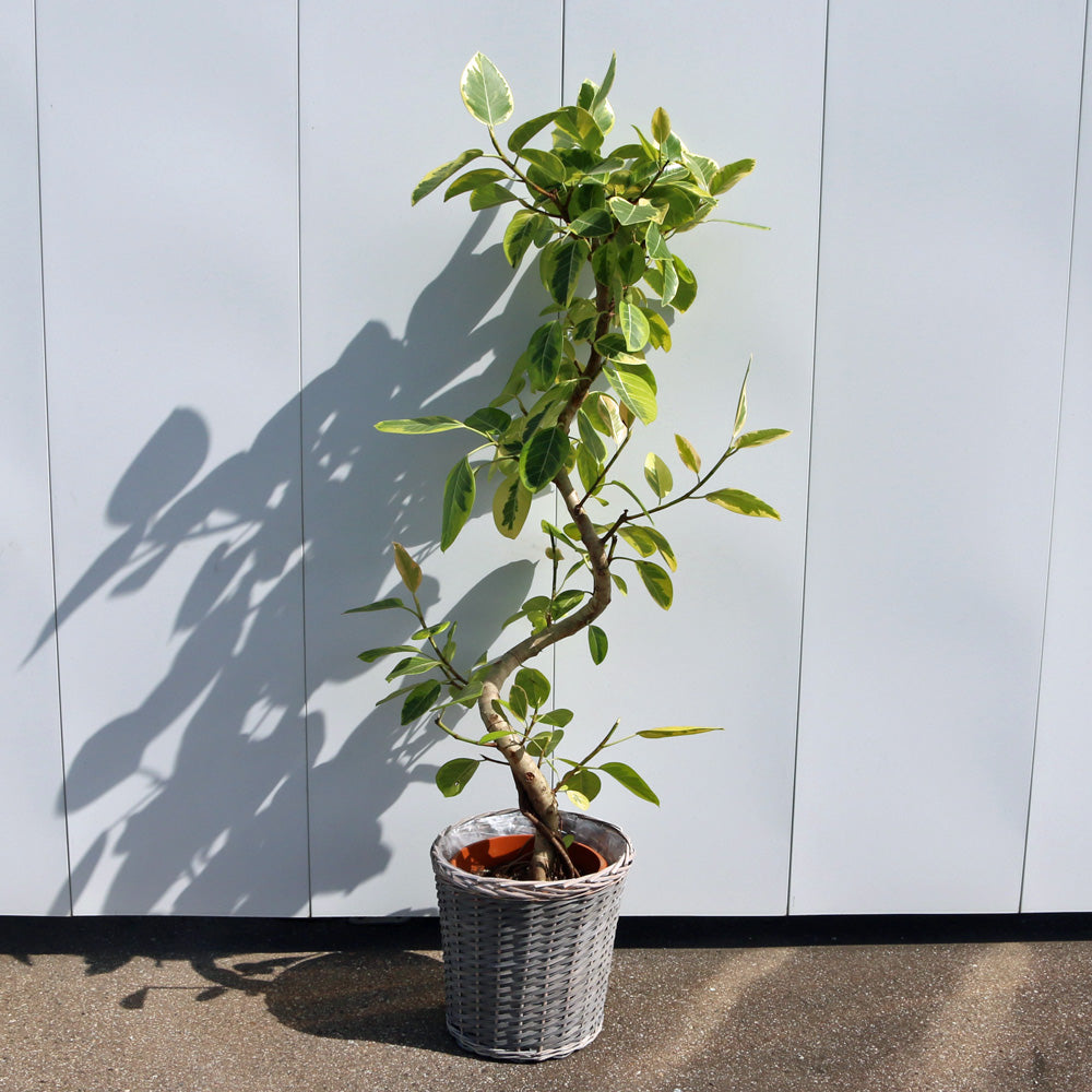 フィカス・アルテシーマは、葉の美しいクリーム色と緑のまだら模様が特徴のゴムの木です。成長するとS字に曲がる幹が個性的で、インテリアにアクセントを加えます。育てる際は明るい間接光を好み、直射日光は葉焼けの原因となるため避けましょう。土の表面が乾いたらたっぷりと水やりをし、過湿を避けることが重要です。空気の流れが良い場所で管理すると、健康的に育ちやすくなります。室内の観葉植物として、空間に自然の彩りと清潔感をもたらします。