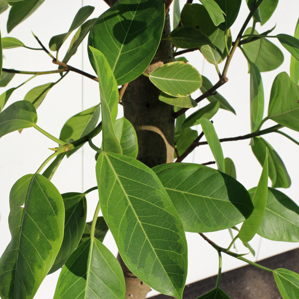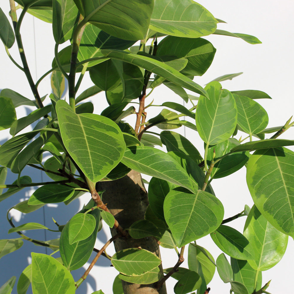 フィカス・アルテシーマは、葉の美しいクリーム色と緑のまだら模様が特徴のゴムの木です。成長するとS字に曲がる幹が個性的で、インテリアにアクセントを加えます。育てる際は明るい間接光を好み、直射日光は葉焼けの原因となるため避けましょう。土の表面が乾いたらたっぷりと水やりをし、過湿を避けることが重要です。空気の流れが良い場所で管理すると、健康的に育ちやすくなります。室内の観葉植物として、空間に自然の彩りと清潔感をもたらします。