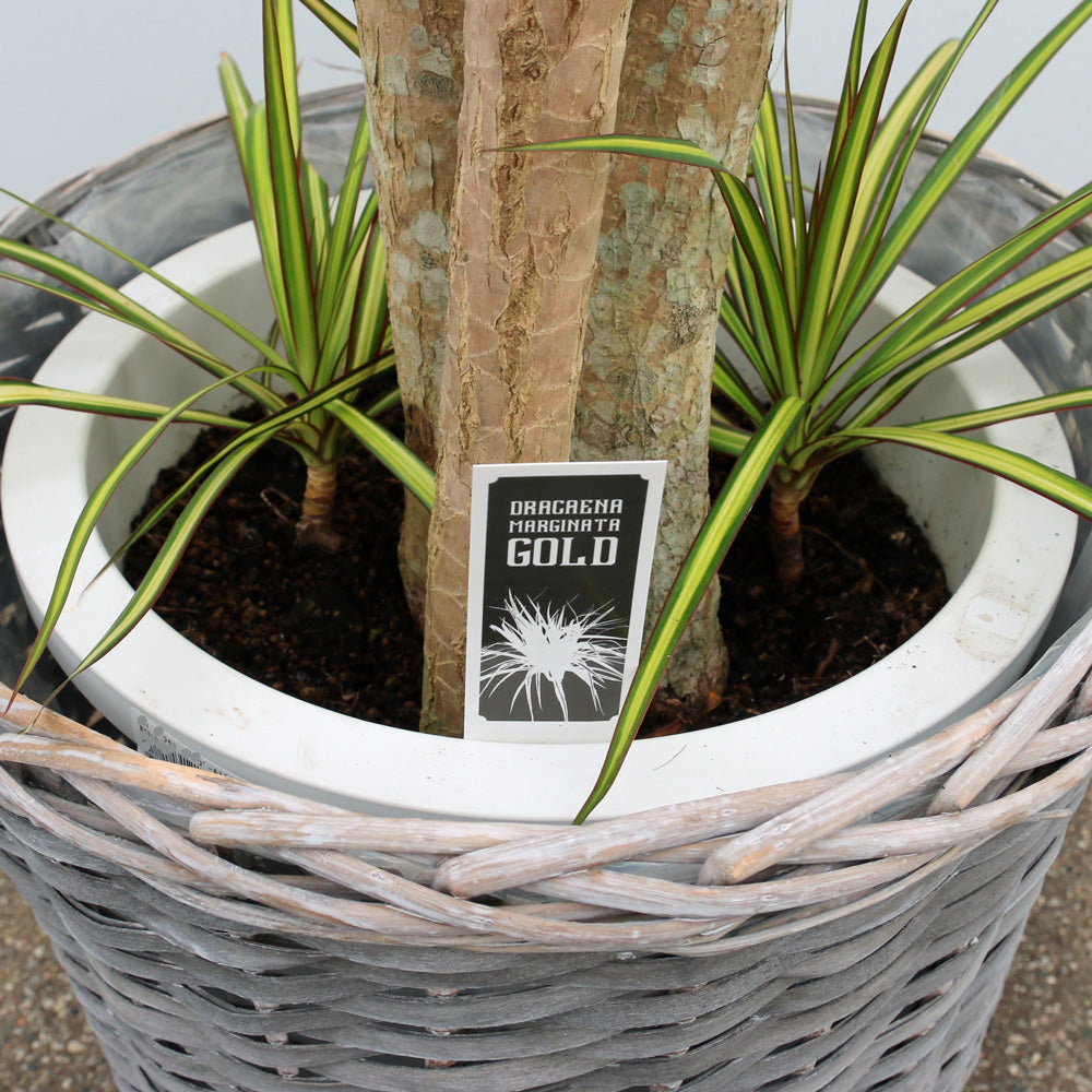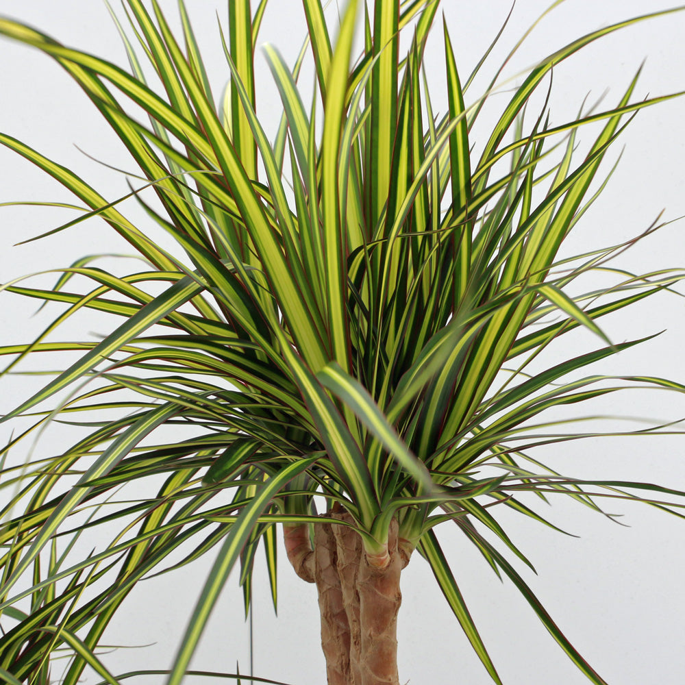 ドラセナ・マジナータ・ゴールド(学名:Dracaena marginata 'Tricolor')は、剣先型の細長い濃緑色の葉に鮮やかな黄色の中斑が入る美しい観葉植物です。