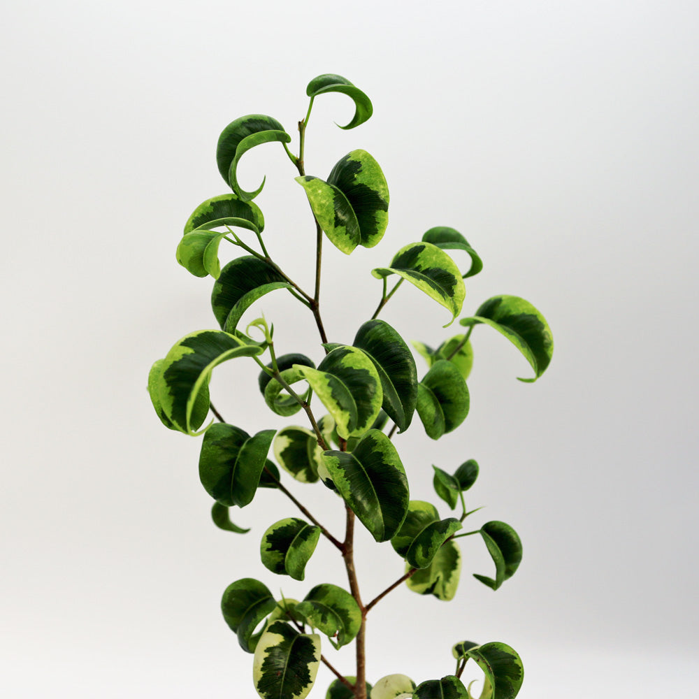 フィカス・ベンジャミンの斑入り品種で、葉に斑(ふ)が入り、くるくるとカールした特徴的な葉が魅力の観葉植物です。日当たりの良い場所を好み、明るい室内でも育てることができますが、直射日光は葉焼けの原因となるため注意が必要です。